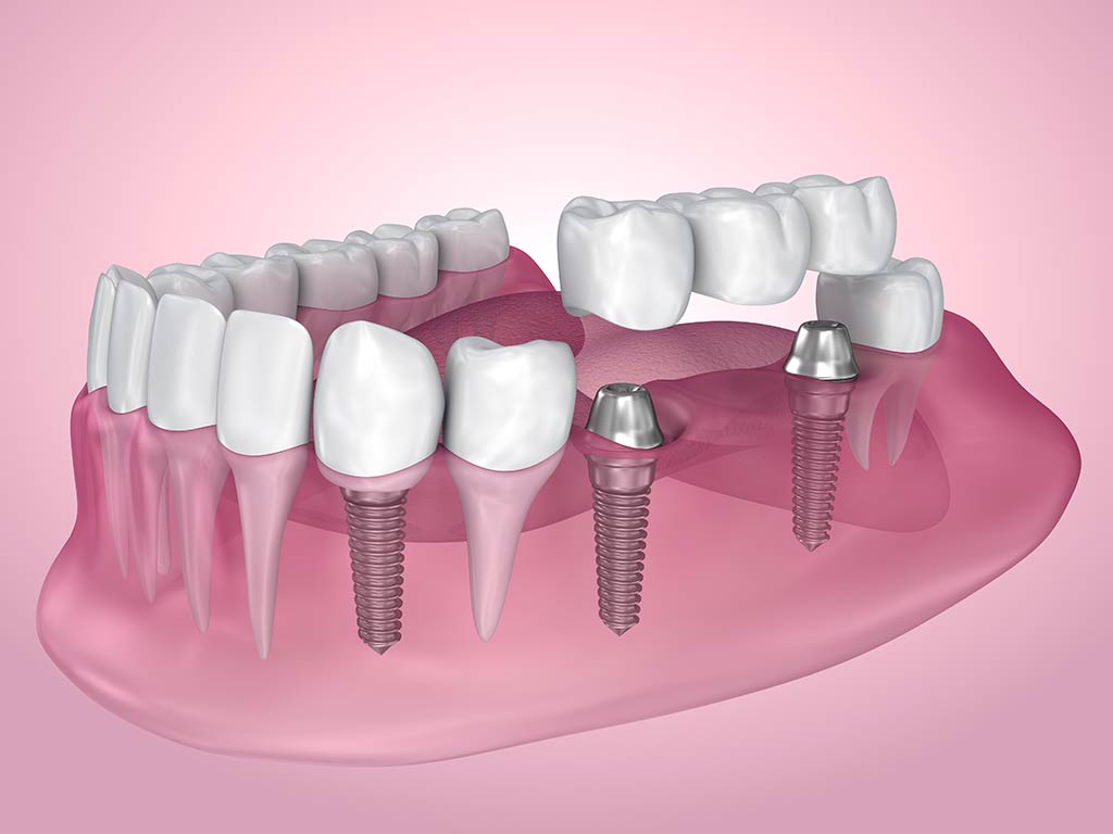 Partial dentures, also known as bridges, replace two or more teeth and, depending on the situation, require two or three implants.