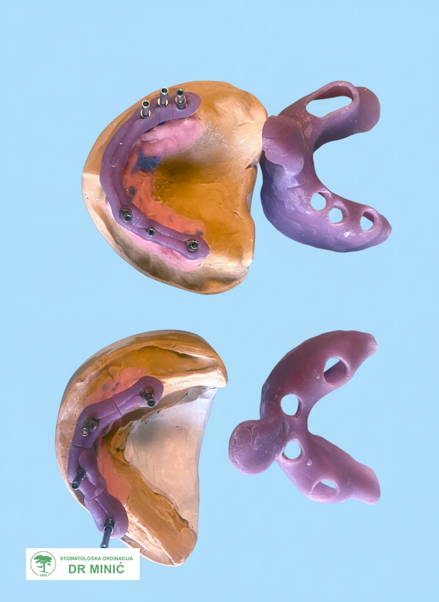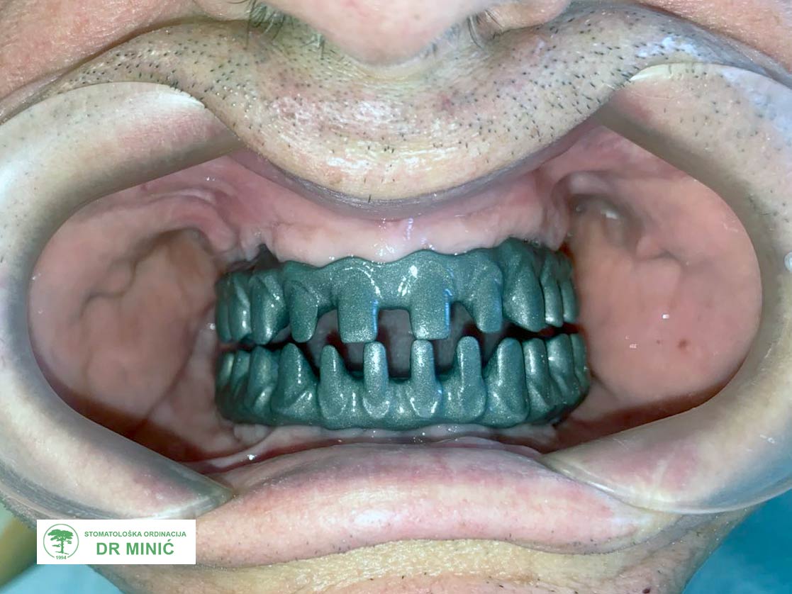 - Zatim je urađena metalna (titanijumska) konstrukcija (prečka) na koju su kasnije postavljeni zubi.