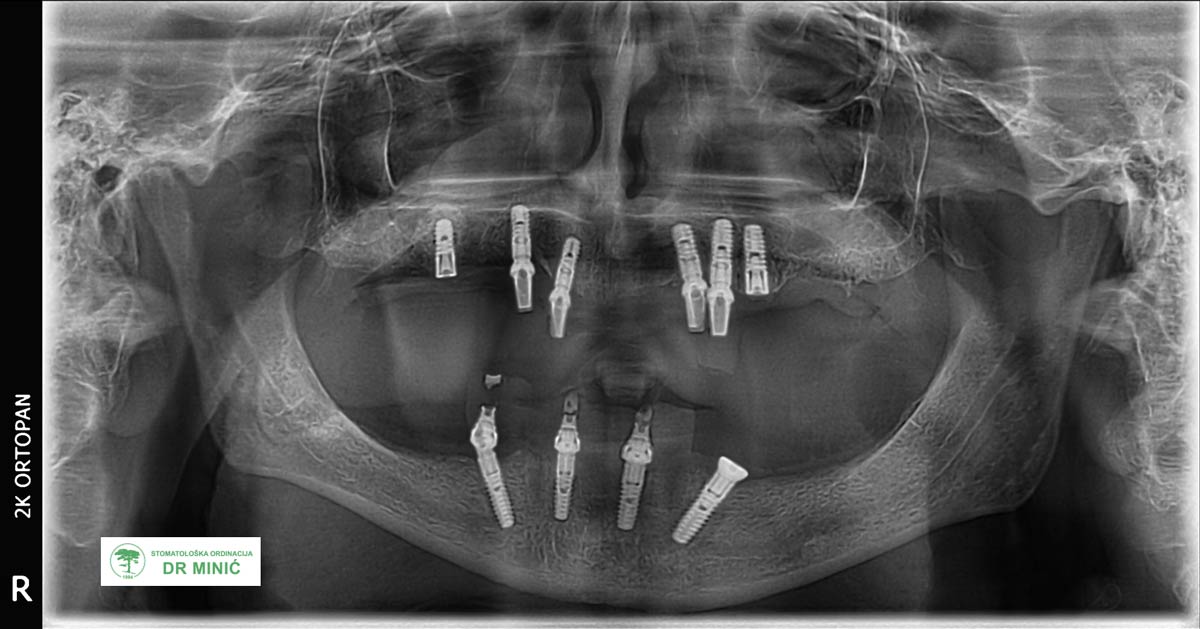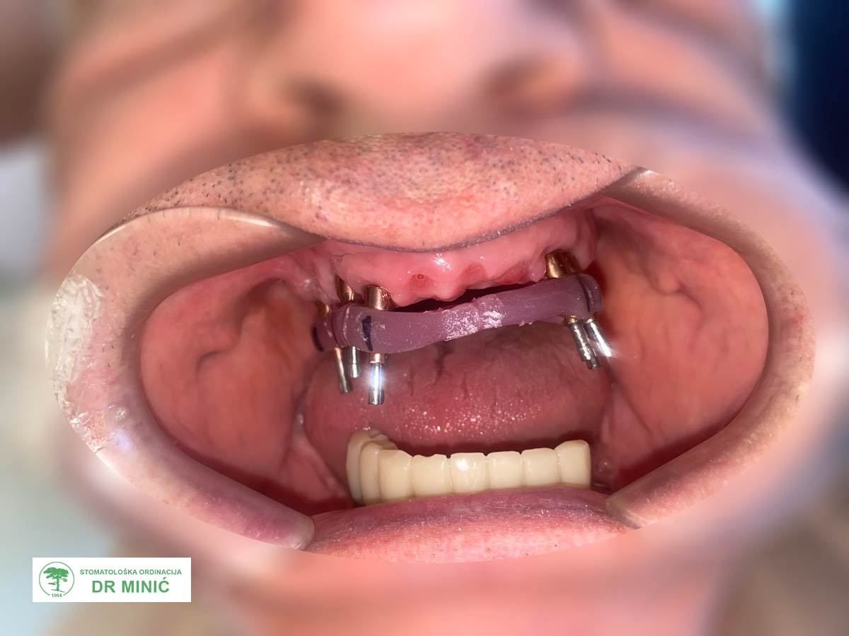 Pacijent ima 70 godina. U gornjoj vilici je ranije rađen metalokeramički most, a u donjoj vilici nedostaje više zuba. Zbog ranijeg gubitka kosti i problema sa desnima (upalom oko implanata), stanje u ustima je bilo složeno i zahtevalo je opsežniju terapiju.